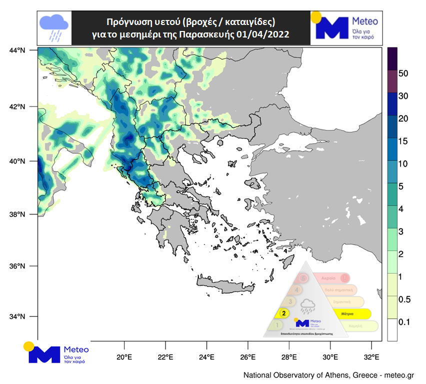 Το επεισόδιο βροχοπτώσεων για την Παρασκευή 01/04 αναμένεται να είναι Κατηγορίας 2 όσον αφορά τον Δείκτη Επικινδυνότητας Επεισοδίου Βροχόπτωσης (Regional Precipitation Index – RPI), υπενθυμίζεται όμως ότι τα φαινόμενα θα επηρεάσουν κυρίως τα δυτικά και βόρεια τμήματα της χώρας. Στον Χάρτη 1 παρουσιάζεται ο υετός (βροχές / καταιγίδες) που αναμένεται το μεσημέρι της Παρασκευής 01/04.