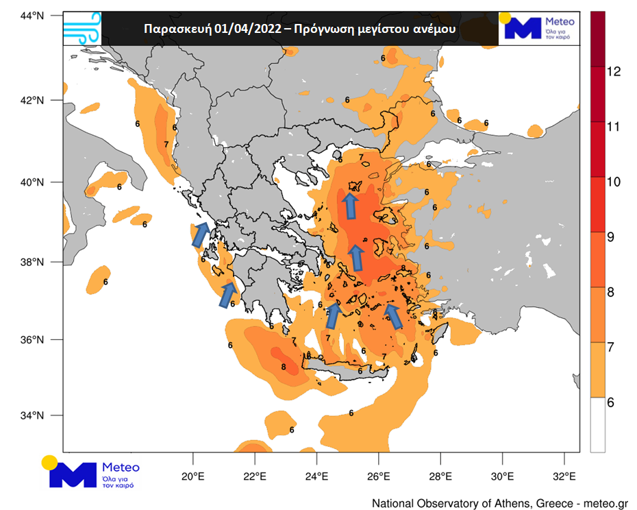 Νότιοι άνεμοι 6 έως 8 μποφόρ θα επικρατήσουν στο Αιγαίο, οι οποίοι έως το μεσημέρι στα ανατολικά τμήματα θα φτάνουν κατά τόπους και τα 9 μποφόρ. Στη συνέχεια θα παρουσιάσουν εξασθένηση και προς το βράδυ δεν θα ξεπερνούν τα 6 έως 7 μποφόρ. Στο Ιόνιο θα επικρατήσουν νότιοι και από το μεσημέρι νοτιοδυτικοί άνεμοι 3 έως 5 και τοπικά έως 6 μποφόρ. Ο υψηλός κυματισμός που αναμένεται κυρίως στα νησιά του Βορείου και Ανατολικού Αιγαίου μπορεί να δημιουργήσει προβλήματα και στις ακτές και συνίσταται προσοχή. Στον Χάρτη 2 παρουσιάζεται η πρόγνωση της μέγιστης έντασης του ανέμου καθώς και της επικρατούσας διεύθυνσης του για την Παρασκευή 01/04.