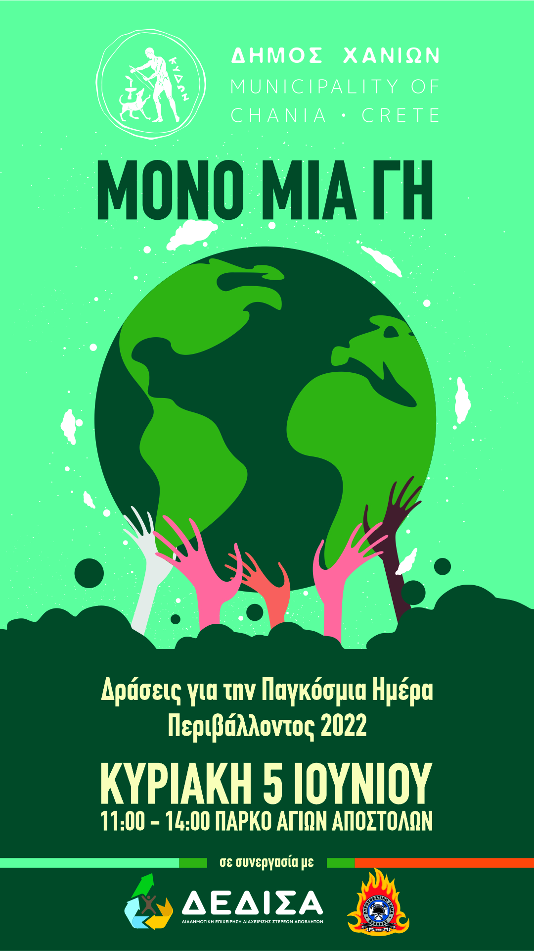 Η Διεύθυνσης Περιβάλλοντος, Καθαριότητας και Πρασίνου του Δήμου Χανίων, σε συνεργασία με τη Διαδημοτική Επιχείρηση Διαχείρισης Στερεών Αποβλήτων (ΔΕΔΙΣΑ ΑΕ) και τη Διεύθυνση Πυροσβεστικών Υπηρεσιών Νομού Χανίων, σας περιμένουν την Κυριακή, 05/06/2022 από τις 11:00 έως τις 14:00, στο Πάρκο των Αγίων Αποστόλων, για να γιορτάσουμε την Παγκόσμια Ημέρα και παράλληλα να μάθουμε, παίζοντας.