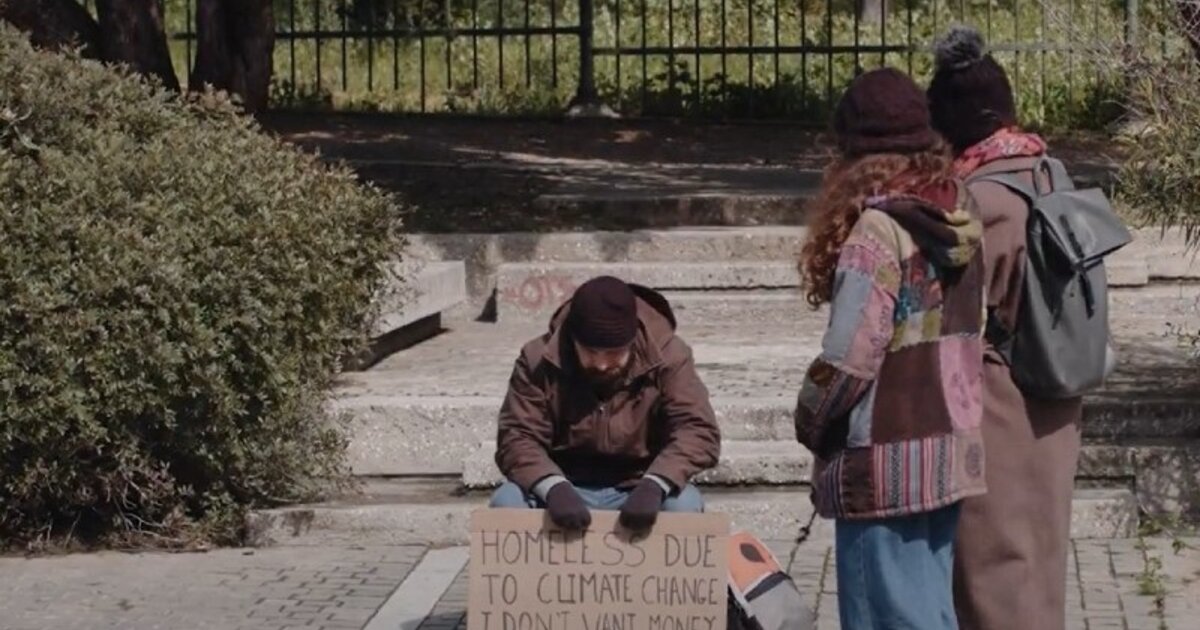 Ένας άστεγος κρατάει μία καρτέλα που έχει γραμμένο το μήνυμα: «άστεγος λόγω κλιματικής αλλαγής, δε ζητάω χρήματα, ζητάω δράση για το κλίμα». Ένας εριστικός περαστικός τον χλευάζει, λέγοντάς του να πάει να βρει δουλειά, καθώς δεν υπάρχει κλιματική αλλαγή, προκαλώντας τις αντιδράσεις άλλων περαστικών που διαφωνούν μαζί του και του απαντούν ότι η κλιματική αλλαγή υπάρχει και τη ζούμε όλοι.