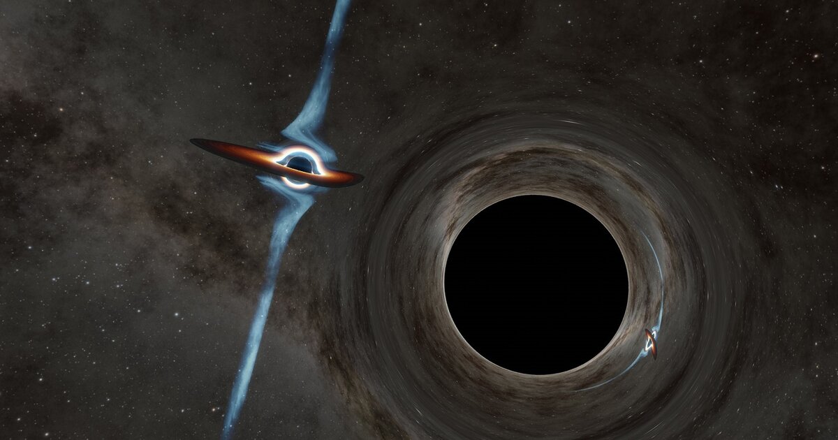 Στην φωτογραφία εξωφύλλου: Καλλιτεχνική απεικόνιση των δύο μελανών οπών, όπως θα έμοιαζαν σε έναν παρατηρητή που βρίσκεται κοντά στη μικρότερη από τις δύο μελανές οπές, κοιτάζοντας προς την μεγαλύτερη, από την οποία εκπηγάζει ο πίδακας. Πηγή εικόνας: Caltech/R. Hurt (IPAC)