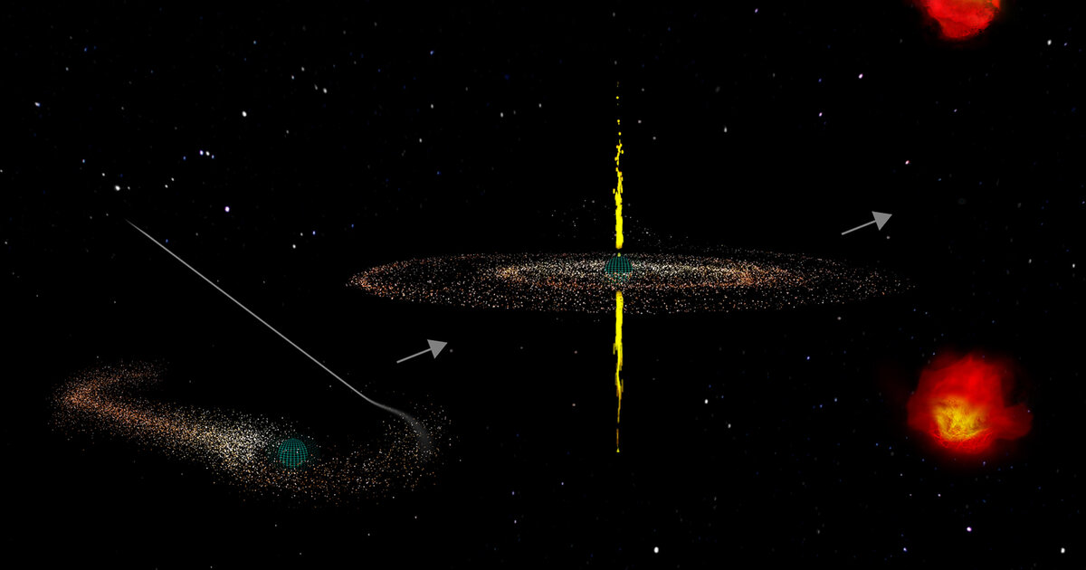 Αυτή η απεικόνιση δείχνει πώς σχηματίζονται πιθανώς τα Συμπαγή Συμμετρικά Αντικείμενα ή CSO. Όταν ένα μεμονωμένο, τεράστιο αστέρι περιπλανιέται πολύ κοντά σε μια μαύρη τρύπα (αριστερά), καταβροχθίζεται και αυτό προκαλεί τη μαύρη τρύπα να εκτοξεύσει έναν υπερταχύ, διπολικό πίδακα (κέντρο). Ο πίδακας εκτείνεται προς τα έξω και τα θερμά του άκρα λάμπουν στα ραδιοκύματα (δεξιά).