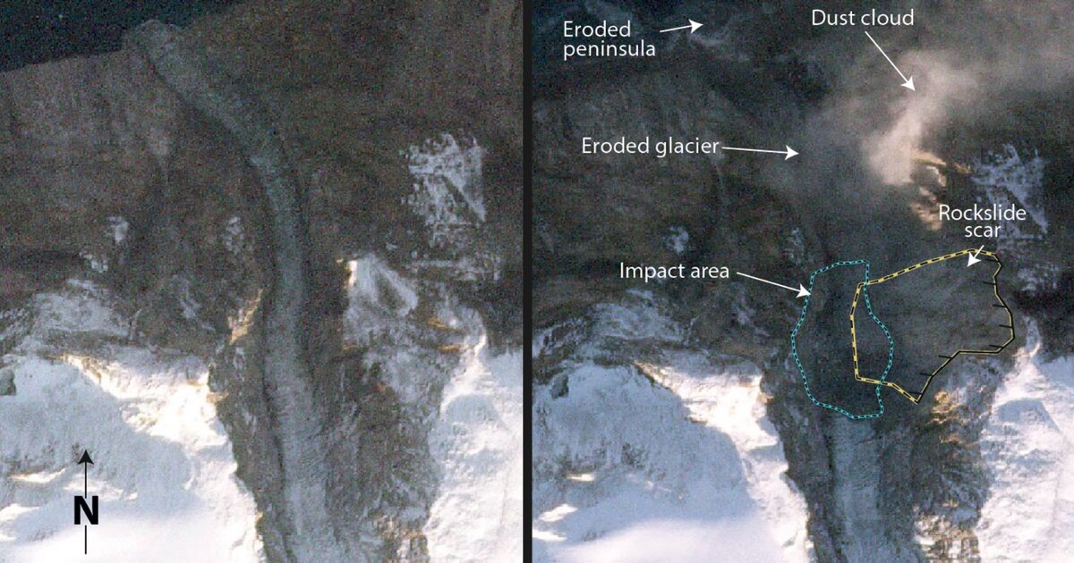 Μια δορυφορική εικόνα έδειξε ένα σύννεφο σκόνης σε μια ρεματιά στο φιόρδ. Η σύγκριση φωτογραφιών πριν και μετά το συμβάν αποκάλυψε ότι ένα βουνό είχε καταρρεύσει και παρέσυρε μέρος ενός παγετώνα στο νερό.