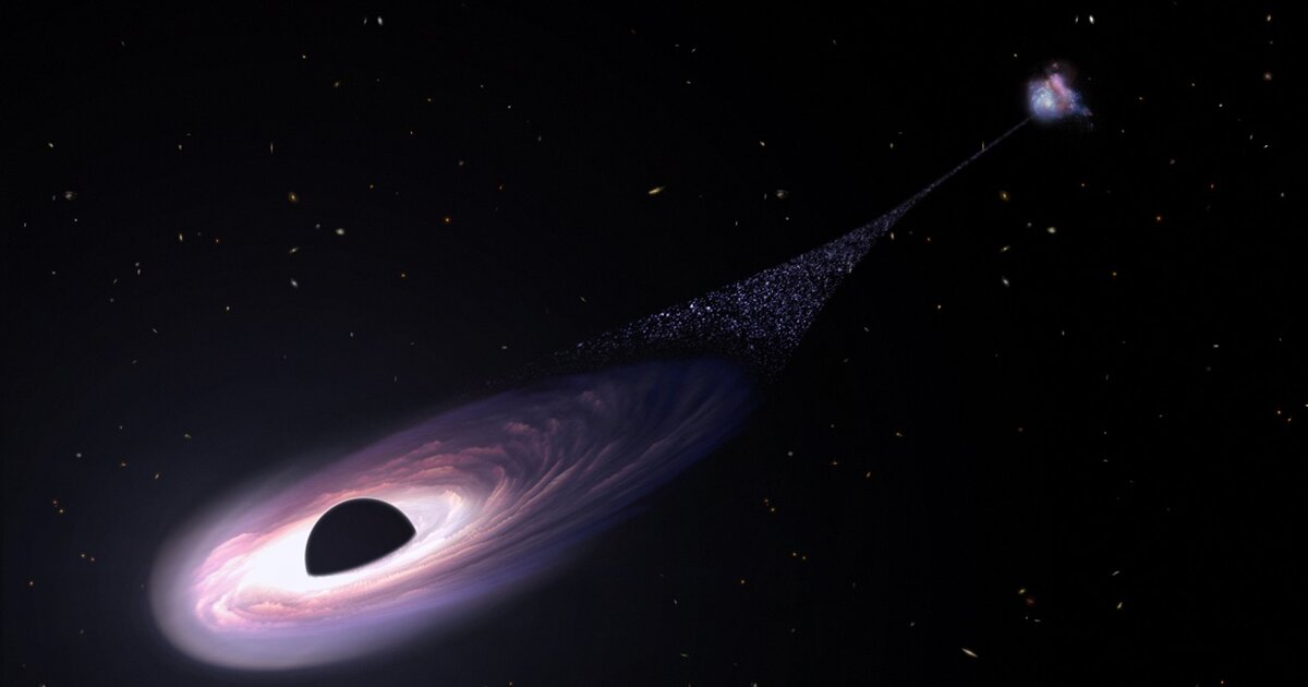Στη φωτογραφία απεικονίζεται η εντύπωση ενός καλλιτέχνη για μια υπερμεγέθη μαύρη τρύπα- δραπέτη, η οποία εκτοξεύεται από τον γαλαξία που τη φιλοξενούσε ως αποτέλεσμα διαμάχης μεταξύ αυτής και δύο άλλων μαύρων τρυπών.