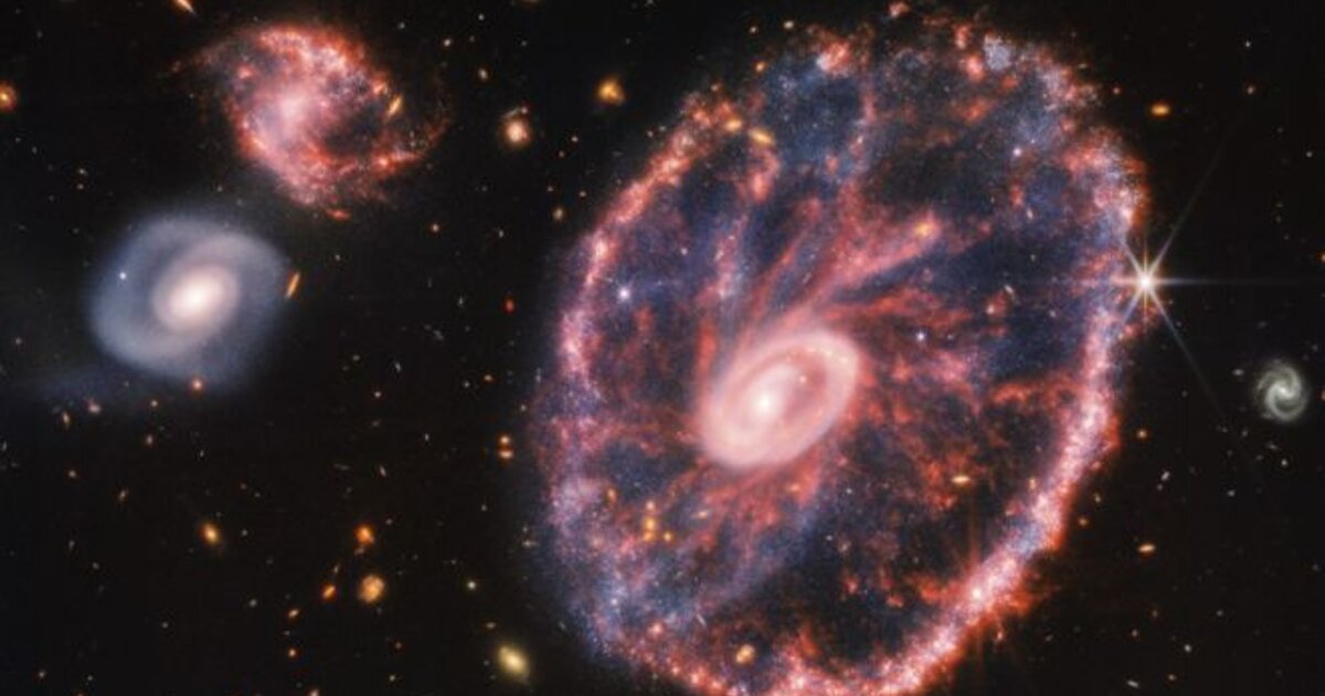 Το ισχυρό James Webb παρήγαγε αυτή τη λεπτομερή εικόνα του Cartwheel και δύο μικρότερων γαλαξιών με φόντο πολλούς άλλους γαλαξίες. Αυτή η εικόνα παρέχει μια νέα άποψη για το πώς ο γαλαξίας Cartwheel έχει αλλάξει κατά τη διάρκεια δισεκατομμυρίων ετών.