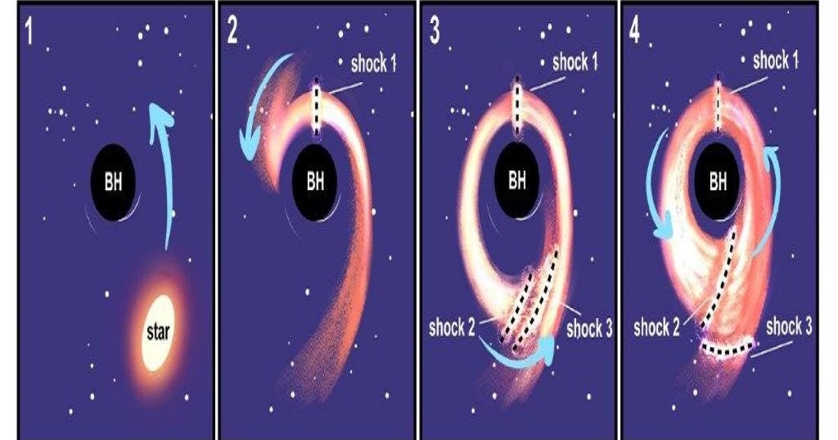 * Στην φωτογραφία: Σε ένα γεγονός παλιρροϊκής διαταραχής (TDE), ένα αστέρι θα βρεθεί πολύ κοντά σε μια υπερμεγέθη μαύρη τρύπα η βαρύτητα της οποίας θα το παραμορφώσει (1) μέχρι να το καταστρέψει. Το αέριο από το αστέρι ακολουθεί ελλειπτική τροχιά στον δρόμο του προς τη μαύρη τρύπα (2). Όπως ρέει το αέριο, συγκρούεται με τον εαυτό του και σχηματίζει κύματα shock κοντά στο περίκεντρο και στο απόκεντρο της τροχιάς του (3). Τα κύματα shock είναι φωτεινά στο οπτικό και υπεριώδες μέρος του φάσματος, και κάνουν το φως πολωμένο. Καθώς εξελίσσεται το φαινόμενο, η τροχιά του αερίου γίνεται όλο και πιο κυκλική (4), και εν τέλει σχηματίζεται ένας δίσκος προσαύξησης μέσω του οποίου το αστρικό αέριο μπορεί τελικά να καταναλωθεί από τη μαύρη τρύπα.