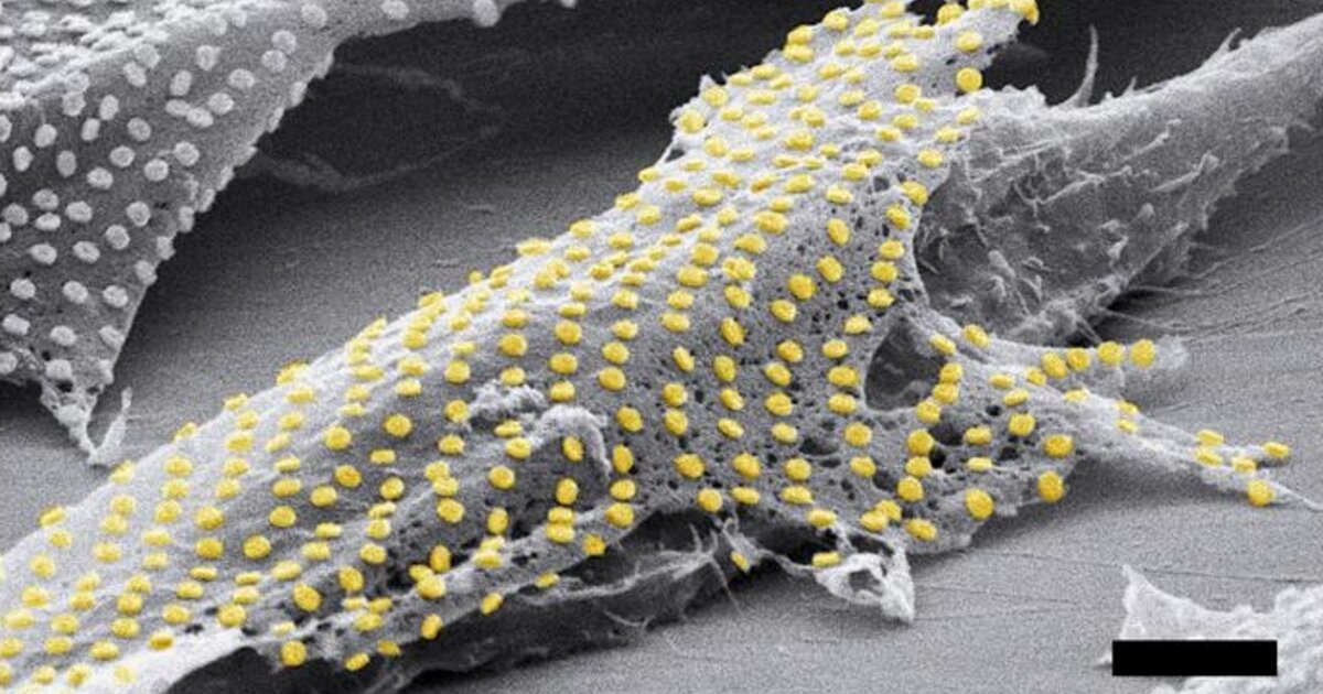 Εκατοντάδες κουκκίδες από χρυσό διακρίνονται στην επιφάνεια του κυττάρου (KAM SANG KWOK AND SOO JIN CHOI, GRACIAS LAB/JOHNS HOPKINS UNIVERSITY)