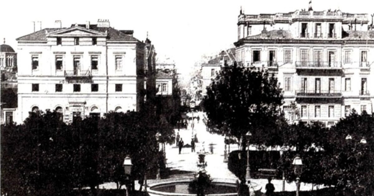 Στην κεντρική φωτογραφία εικονίζεται η Πλατεία Συντάγματος το 1870. Αριστερά διακρίνεται το Μέγαρο Κορομηλά