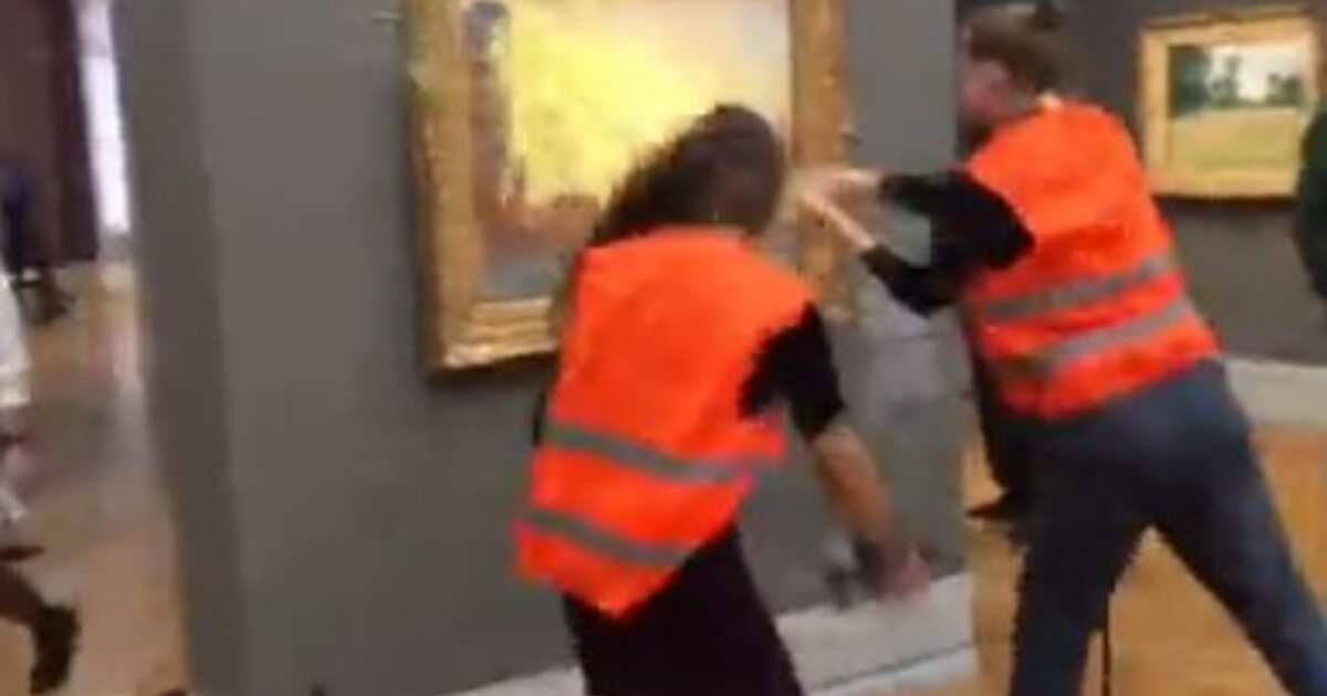 Αφού οι δύο ακτιβιστές πέταξαν πουρέ πατάτας πάνω στον πίνακα Les Meules κόλλησαν τα χέρια τους στον τοίχο του μουσείου. Όπως είπαν η διαμαρτυρία σχεδιάστηκε ως κλήση αφύπνισης ενόψει της κλιματικής καταστροφής.