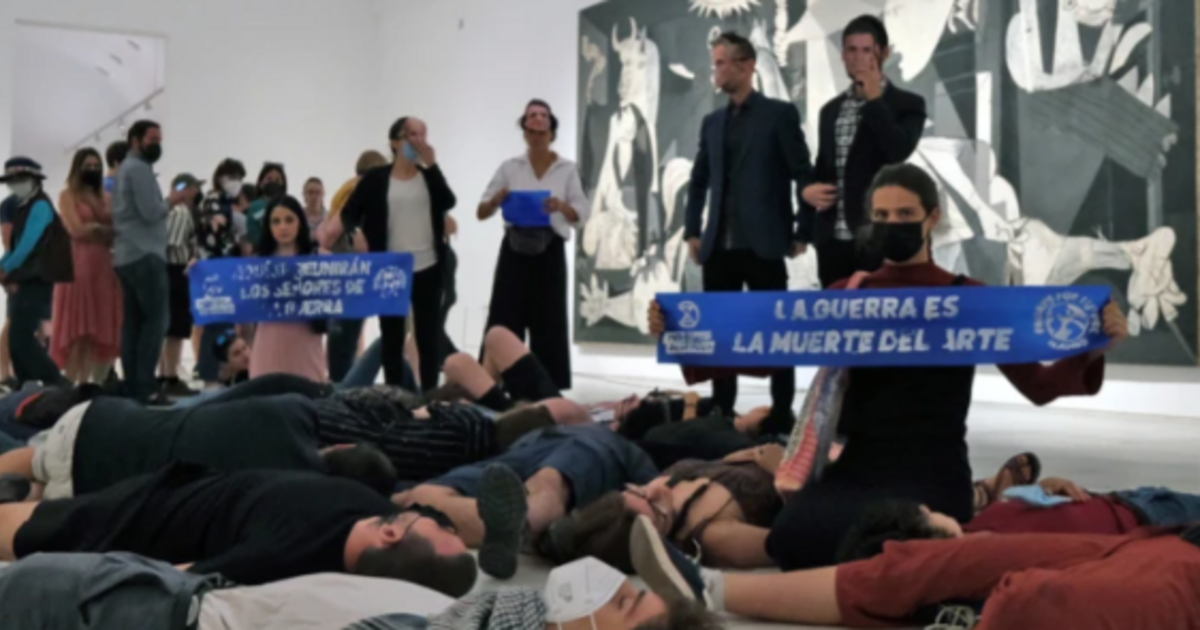 Σε φωτογραφίες και βίντεο που αναρτήθηκαν σε ιστοτόπους κοινωνικής δικτύωσης, διακρίνονται καμιά δεκαριά ακτιβιστές, ξαπλωμένοι στο πάτωμα, στο Μουσείο Ρέινα Σοφία, να υποδύονται τους νεκρούς μπροστά από το αριστούργημα του Πικάσο, το οποίο είναι εμπνευσμένο από τον βομβαρδισμό της πόλης Γκουέρνικα κατά τη διάρκεια του ισπανικού Εμφυλίου Πολέμου.