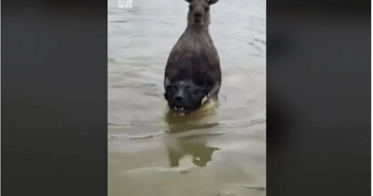 Το βίντεο που κατέγραψε το περιστατικό δείχνει τον άνδρα να πλησιάζει το καγκουρό, το οποίο κρατά τον σκύλο του στο νερό, ενώ τον κοιτάζει διερευνητικά