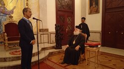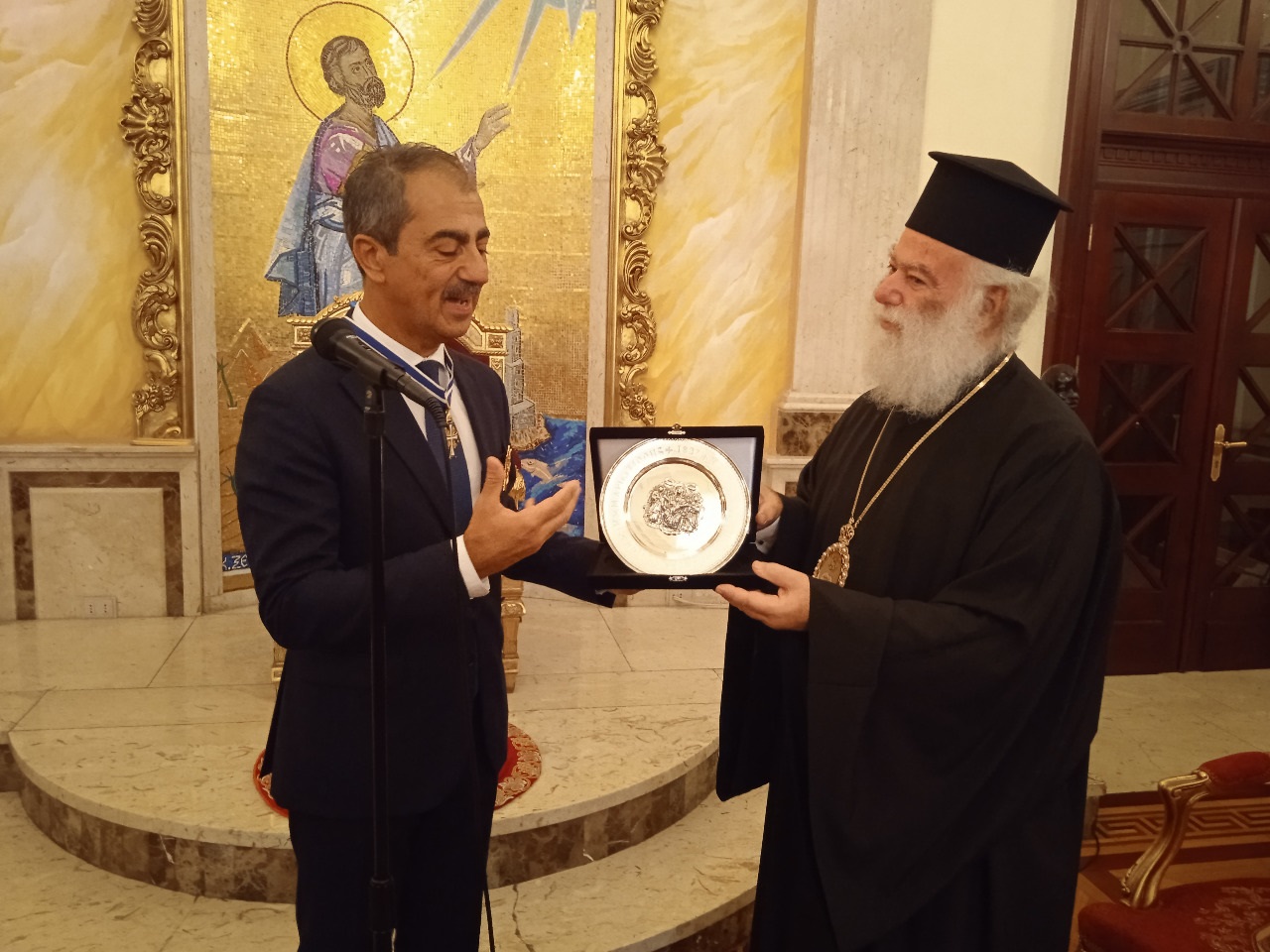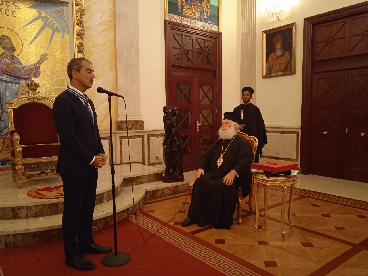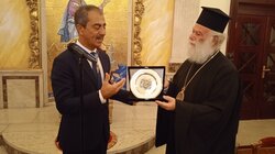 Από την πλευρά του ο τιμώμενος, εξέφρασε την συγκίνησή που αισθάνεται ευρισκόμενος στην Καθέδρα της Εκκλησίας του Αγίου Μάρκου με την πολύτιμη ιστορία της και ευχαρίστησε ευγνωμόνως τον Μακαριώτατο Πατριάρχη για την προσγενομένη τιμή. Ακολούθησε ανταλλαγή αναμνηστικών δώρων και περιήγηση στους χώρους του Πατριαρχικού Μεγάρου