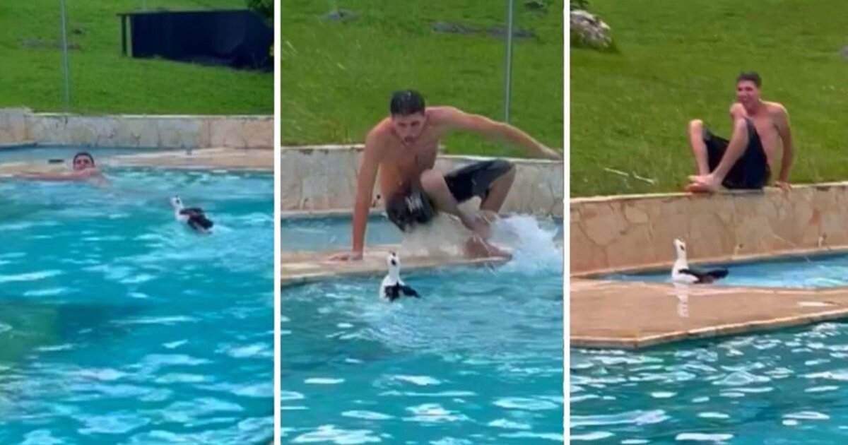 Μέσα στην πισίνα κολυμπούσε και μια χαριτωμένη πάπια που δεν χάρηκε ιδιαίτερα για την ...παρέα και υποχρέωσε τον άνδρα σε άτακτη υποχώρηση!