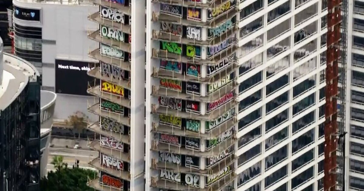 Άγνωστοι βανδάλισαν συγκρότημα εγκαταλελειμμένων ουρανοξυστών κόστους 1 δισεκατομμυρίου δολαρίων με γκραφίτι, αυτή την εβδομάδα στο Λος Άντζελες, Καλιφόρνια.