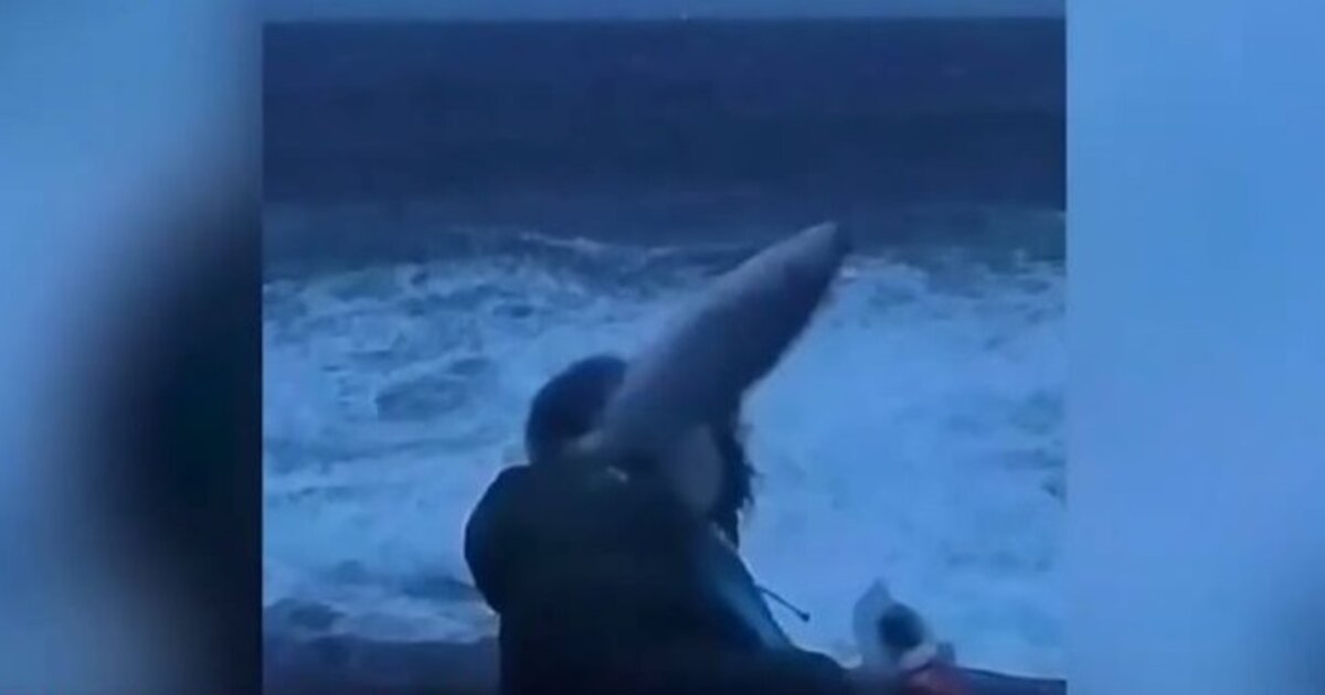 Λόγω των ισχυρών ανέμων το ψάρι ξεπήδησε από νερό και πέτυχε στο πρόσωπο τον δημοσιογράφο, ρίχνοντάς τον κάτω, ενώ στη συνέχεια κόντεψε να το παρασύρει το κύμα.