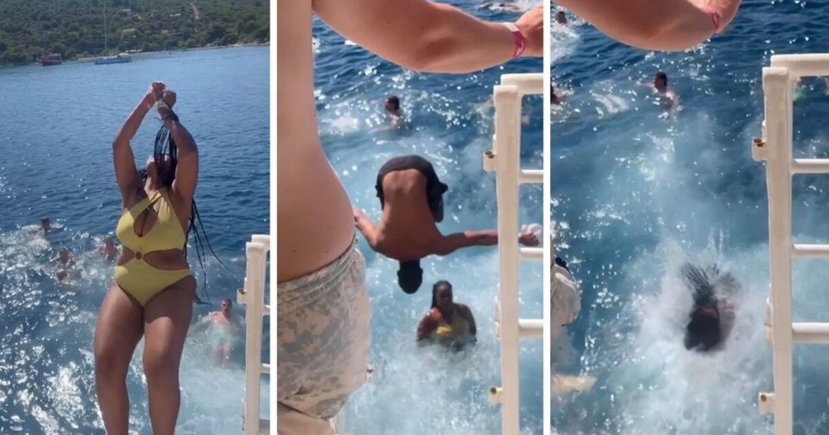 Τα πράγματα σε αυτό το πάρτι πάνω σε σκάφος θα μπορούσαν να έχουν πάρει άσχημη τροπή. Μια από τους συμμετέχοντες αποφάσισε να κάνει βουτιά με ανάποδη τούμπα στο νερό κι αμέσως μετά, την ακολούθησε ένας άλλος επιβάτης του σκάφους πέφτοντας, όμως, ακριβώς πάνω της. Ευτυχώς, το περιστατικό δεν είχε κακή κατάληξη. Η γυναίκα απλώς παρά λίγο... να πνιγεί.