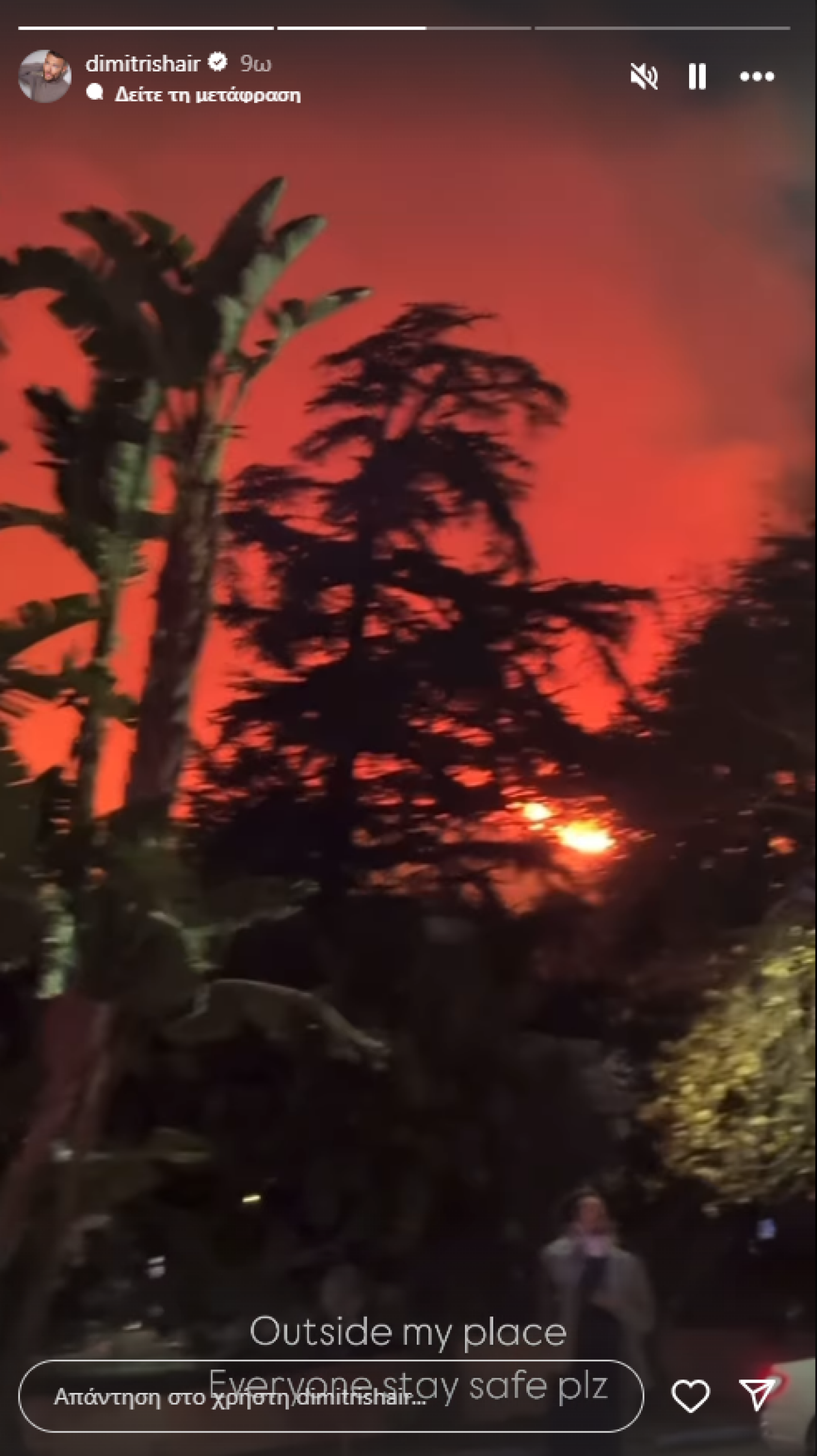 Συγκεκριμένα, ενημέρωσε τους διαδικτυακούς της φίλους στο Instagram για την κατάσταση που επικρατεί και δημοσίευσε βίντεο από την περιοχή του, που δείχνει την πύρινη λαίλαπα σε κοντινή απόσταση από το σπίτι του. Παρότι εξέφρασε ανησυχία για την τύχη του, ανέφερε πως μέχρι στιγμής δεν γνωρίζει αν έχει σωθεί ή αν έχει καταστραφεί. «Ακόμα δεν ξέρω αν σώθηκε το σπίτι μου», γράφει χαρακτηριστικά.