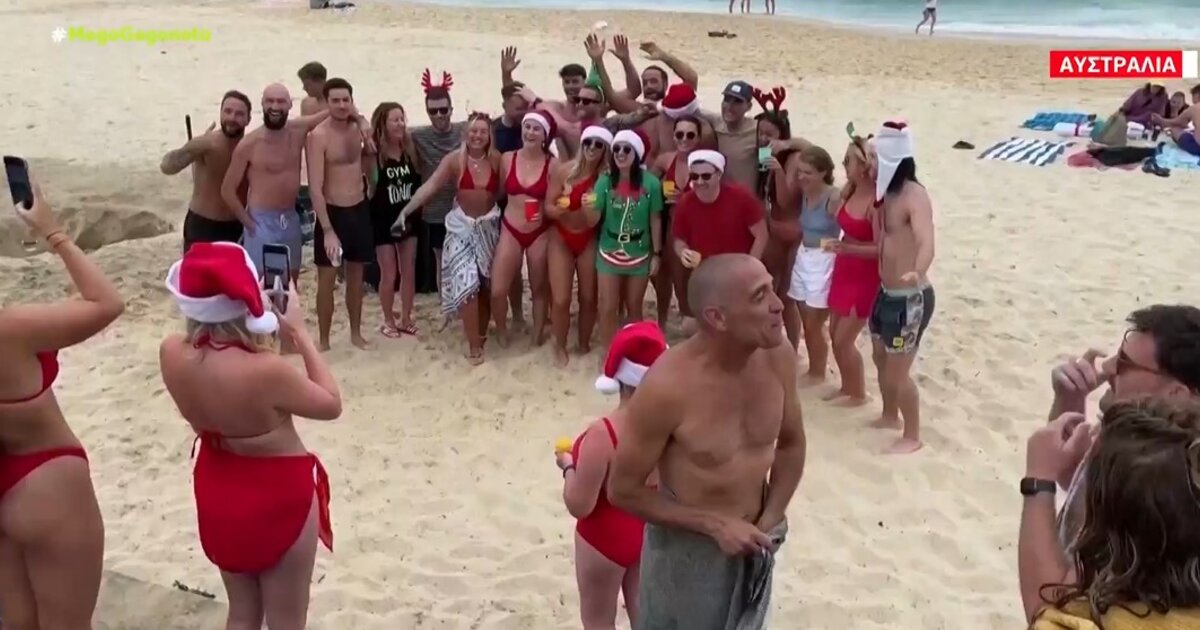 Φορώντας μαγιό και σκούφους του Άη Βασίλη απολαμβάνουν τον καλοκαιρινό ήλιο αλλά και τα πρώτα Χριστούγεννα χωρίς περιορισμούς που είχε επιβάλλει για τρία χρόνια η πανδημία.