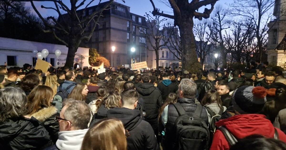 Με αυτούς τους στίχους από το ποίημα του Γιάννη Ρίτσου «Το στίγμα της απουσίας» ολοκληρώθηκε μια μεγαλειώδης συγκέντρωση στο Λονδίνο το βράδυ της Παρασκευής, με αφορμή τη συμπλήρωση 2 ετών από το δυστύχημα των Τεμπών. Πάνω από 5.000 άτομα συγκεντρώθηκαν έξω από την Ελληνική πρεσβεία ζητώντας «δικαίωση για τις 57 ζωές που χάθηκαν» στο τραγικό δυστύχημα. «Ίσως ποτέ άλλοτε δεν μαζεύτηκε τόσος πολύς κόσμος έξω από την Ελληνική πρεσβεία», έλεγαν παλιότεροι Έλληνες κάτοικοι της Βρετανικής πρωτεύουσας.