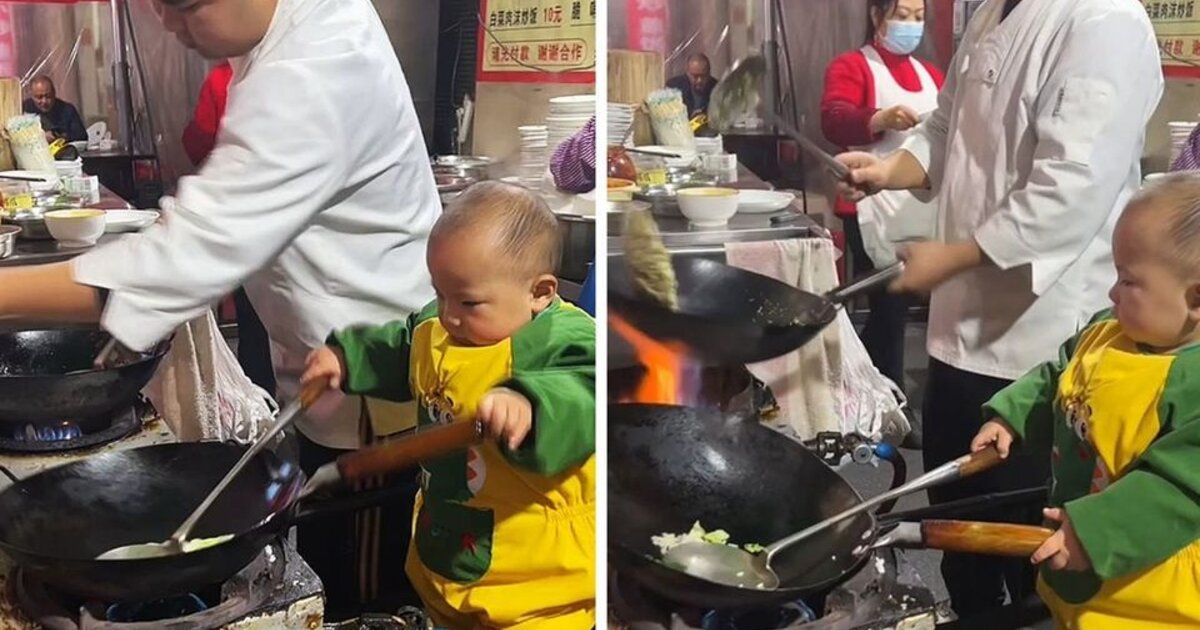 Το χαριτωμένο βρέφος χειρίζεται το τηγάνι με ζέση και μάλλον προπονείται να αναλάβει την οικογενειακή επιχείρηση στο μέλλον.