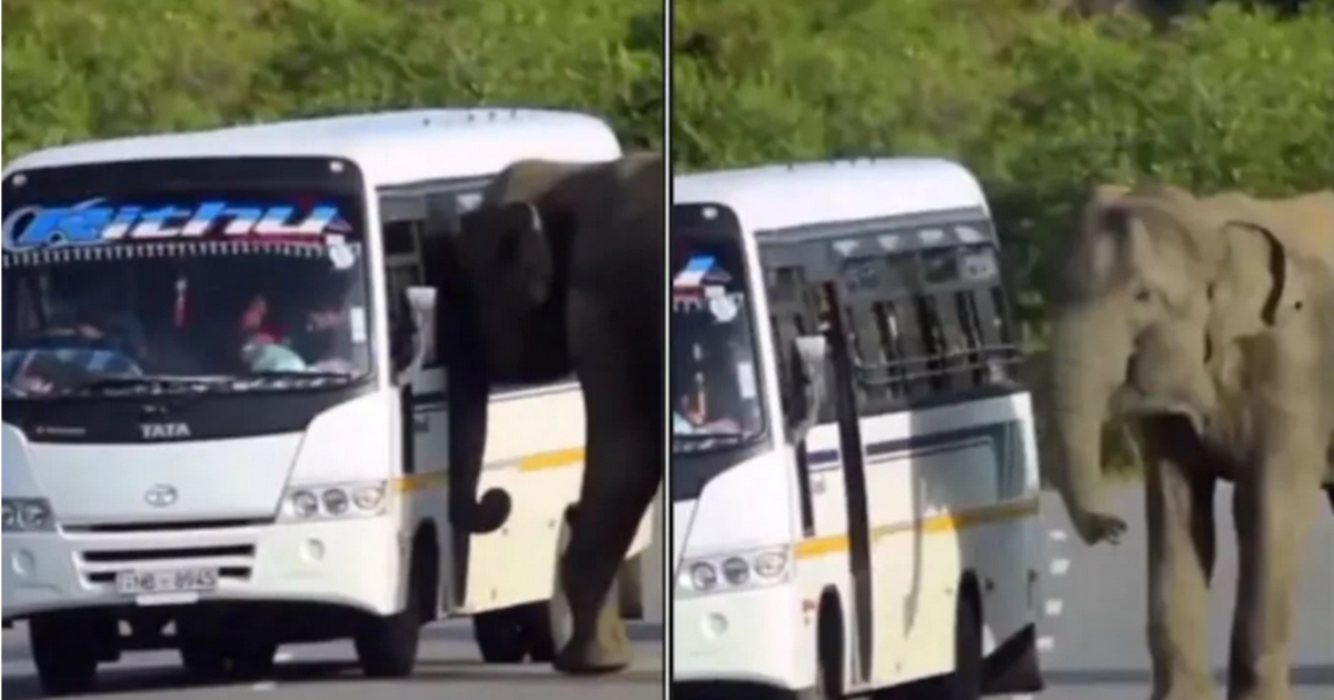 Viral έχει γίνει ένα βίντεο που δείχνει έναν ελέφαντα να σταματά ένα λεωφορείο στην μέση του δρόμου και να προσπαθεί να μπει μέσα.