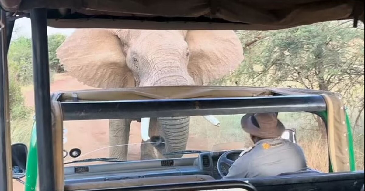 Οι επιβάτες ακούγονται να ουρλιάζουν ενώ ο οδηγός φωνάζει δυνατά στο τεράστιο θηλαστικό για να απομακρυνθεί από το όχημα, στο εθνικό πάρκο Pilanesberg κοντά στο Γιοχάνεσμπουργκ.