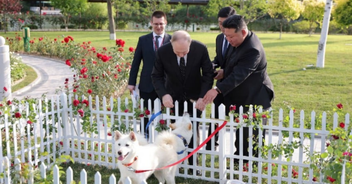 Οι Κιμ και Πούτιν φαίνονται να κοιτάζουν τους δύο σκύλους, οι οποίοι είναι δεμένοι σ’ ένα φράκτη καλυμμένο με τριαντάφυλλα, σε εικόνες που προβλήθηκαν σήμερα από την ελεγχόμενη από το κράτος Κορεατική Κεντρική Τηλεόραση.