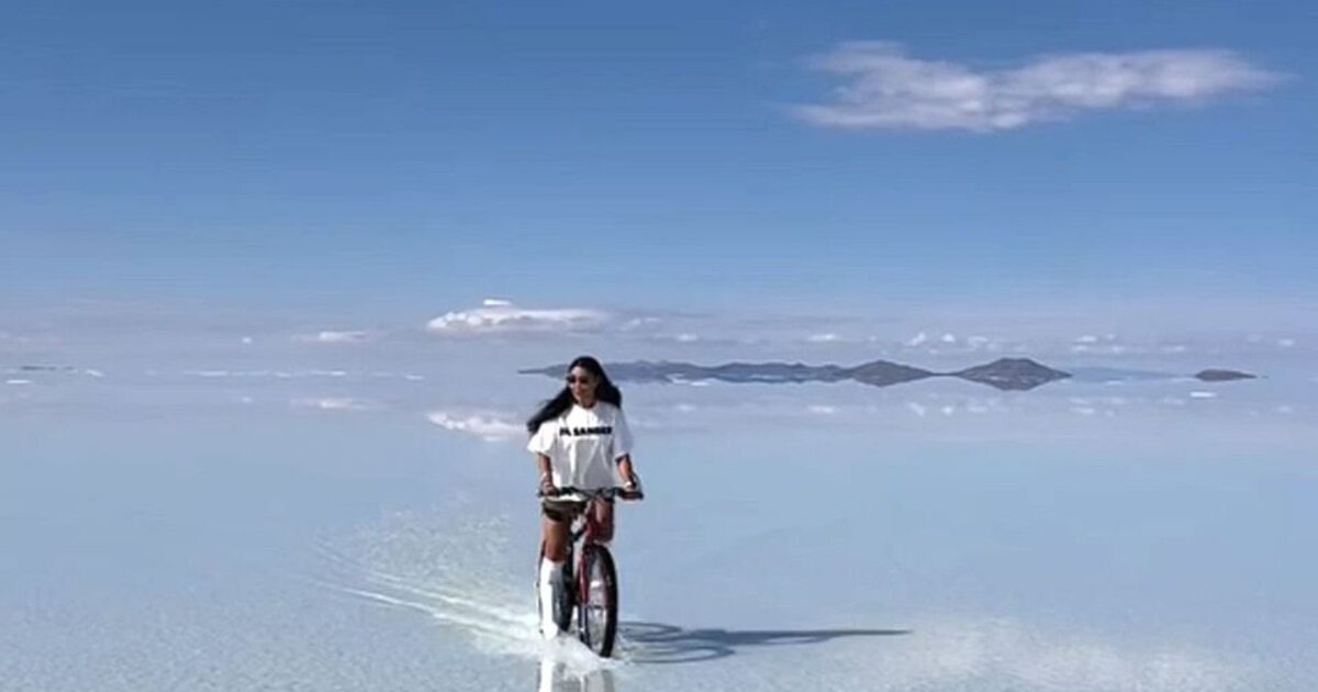 Με μέγεθος 10.582 τετραγωνικά χιλιόμετρα, η αλυκή γίνεται ένας τέλειος καθρέπτης του ουρανού μετά από κάθε βροχή, όπως φαίνεται σε βίντεο γυναίκας που κάνει ποδήλατο στην αλυκή την 1η Απριλίου και μοιάζει σαν να βρίσκεται ανάμεσα στα σύννεφα.