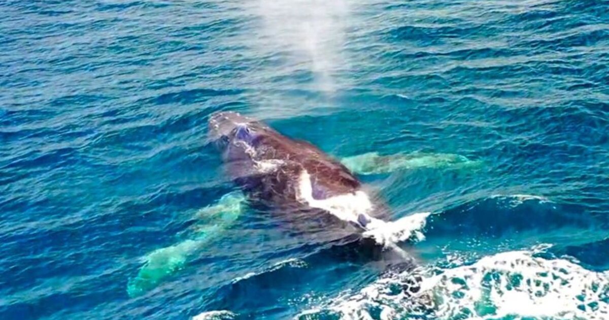Ο φακός του drone που κατέγραψε το περιστατικό, δείχνει τις φάλαινες να χορεύουν κυριολεκτικά μπαινοβγαίνοντας στο νερό.