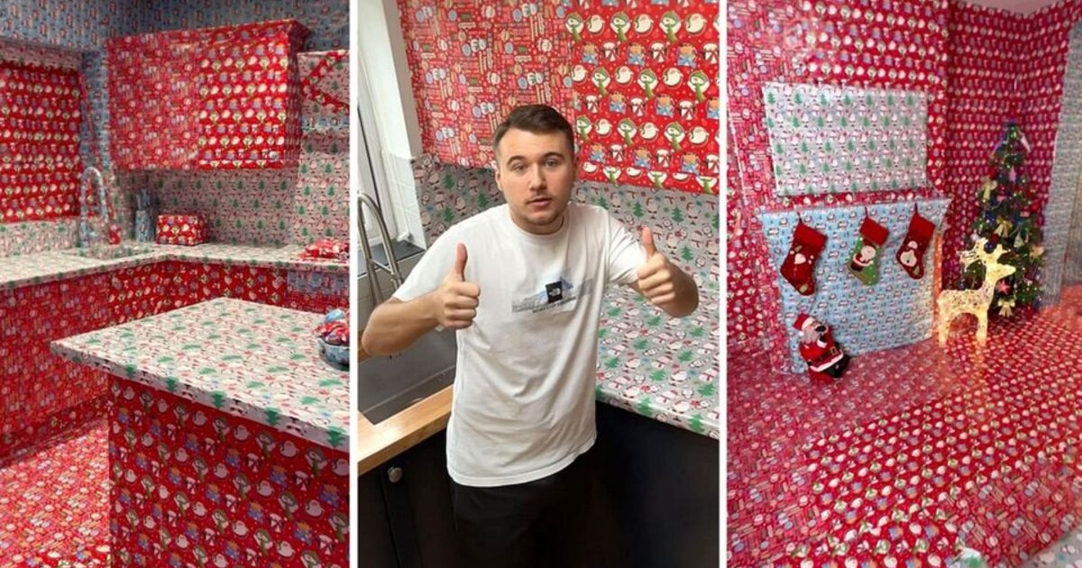 Ένας νεαρός λάτρης της φάρσας αφιέρωσε πέντε ημέρες και ξόδεψε 300 ευρώ για να ντύσει ολόκληρο το σπίτι της οικογενείας του στο Λονδίνο, Ηνωμένο Βασίλειο, με Χριστουγεννιάτικο χαρτί περιτυλίγματος!