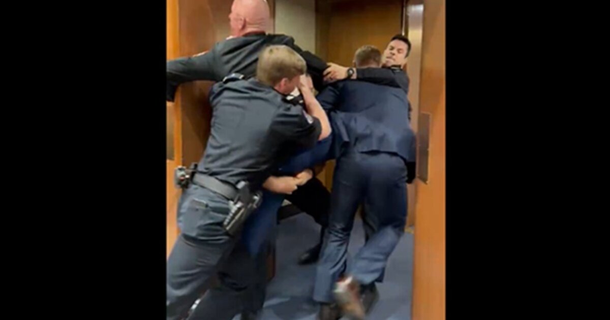 Στο βίντεο φαίνεται ο υποψήφιος γερουσιαστής με το κόμμα των Πράσινων, Μπράιαν ΜακΓκίνις, φωνάζει «κανείς δεν θέλει να πολεμήσει για το Ισραήλ» με αστυνομικούς να προσπαθούν να τον απομακρύνουν.
