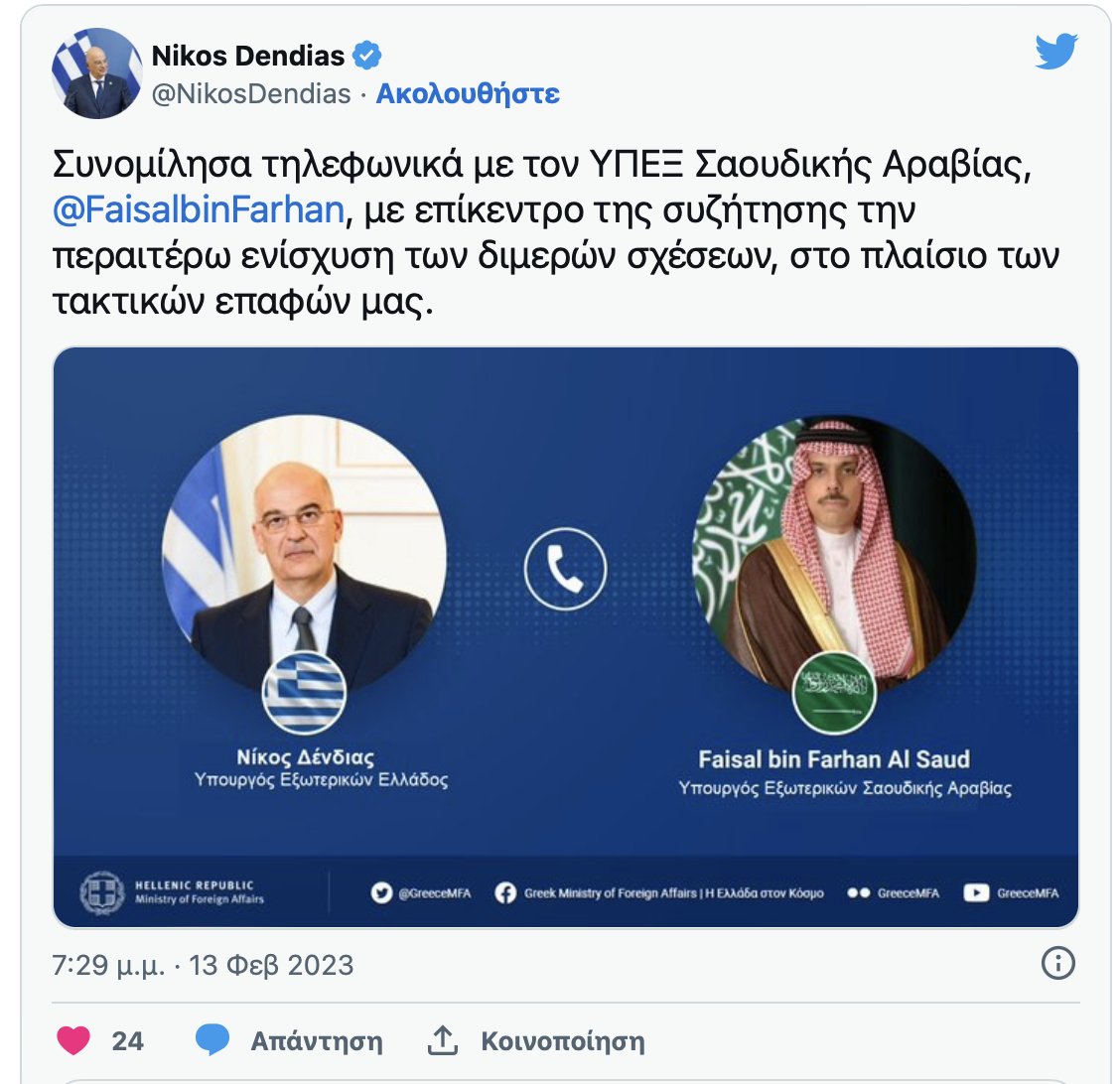 Επικοινωνία Ν. Δένδια με τον ΥΠΕΞ της Σαουδικής Αραβίας