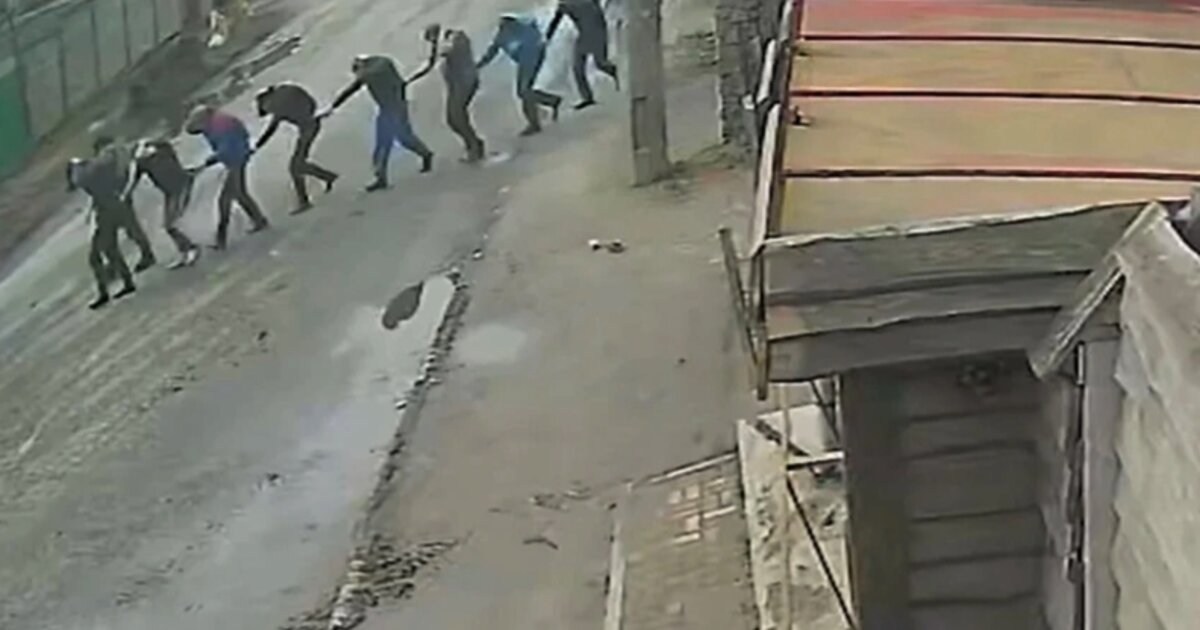 «Όμηροι κείτονται ξαπλωμένοι εκεί, κοντά στον φράχτη» ακούγεται να λέει το άτομο που τράβηξε το ένα από τα βίντεο. Μετράει: «Ένας, δύο, σίγουρα τρεις, τέσσερις, πέντε, έξι...» . Συνολικά εννέα άτομα έχουν τεθεί υπό κράτηση. Οι στρατιώτες υποχρεώνουν τους άνδρες να ξαπλώσουν στο έδαφος. Ανάμεσά στους Ουκρανούς αιχμαλώτους βρίσκεται και ένας άνδρας με γαλάζιο φούτερ με κουκούλα.