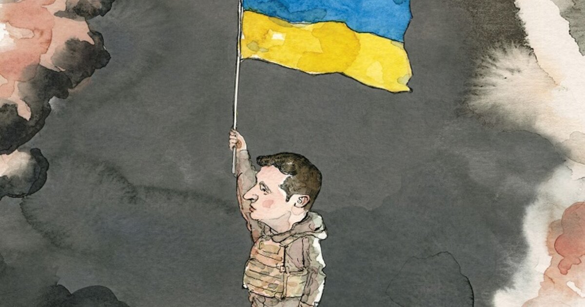 Το σκίτσο απεικονίζει τον Ουκρανό πρόεδρο να στέκεται μόνος του εν μέσω εκρήξεων κρατώντας ψηλά την ουκρανική σημαία