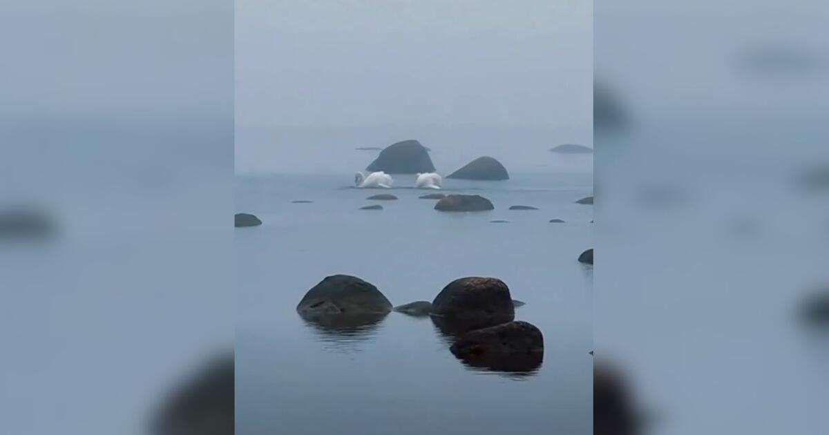 Μέσα στην απαλή πρωινή ομίχλη του Κόλπου της Φινλανδίας, δύο κύκνοι προσφέρουν ένα θέαμα που μοιάζει βγαλμένο από παραμύθι.