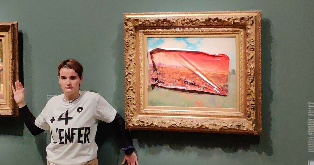 Βίντεο της οργάνωσης Riposte alimentaire, που ευθύνεται για σειρά επιθέσεων κατά έργων τέχνης, που αναρτήθηκε στο Χ δείχνει γυναίκα που παρουσιάζεται ως «στρατευμένη πολίτης» να κολλά στον ιμπρεσιονιστικό πίνακα που αποτυπώνει τοπίο με παπαρούνες ένα αυτοκόλλητο πόστερ με εικόνα αποκάλυψης σε κόκκινο χρώμα.