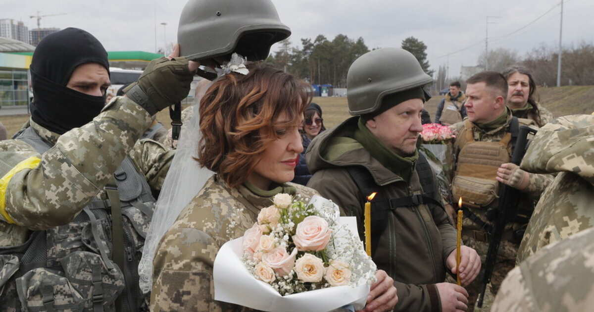 Ένα ζευγάρι που ανήκει στις εδαφικές δυνάμεις άμυνας της Ουκρανίας, σύμφωνα με το BBC, δέθηκε με τα ιερά δεσμά του γάμου στο ύπαιθρο, όχι πολύ μακριά από ένα σημείο ελέγχου στα περίχωρα του Κιέβου.