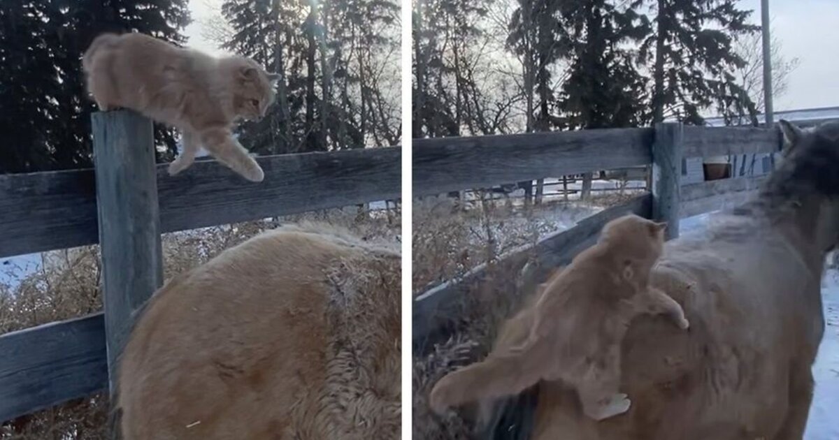 Σε μια κωμική περίσταση στην Αλμπέρτα του Καναδά, στα μέσα του περασμένου Φεβρουαρίου, μια γάτα ...καουμπόι θεώρησε ότι η πλάτη ενός αλόγου δίπλα της θα ήταν πολύ πιο ζεστή για να καθίσει. Και πήδηξε στην πλάτη του αλόγου αλλά λίγο άγαρμπα, με αποτέλεσμα να το τρομάξει.