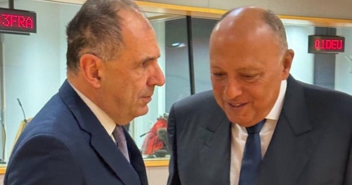 Ο υπουργός Εξωτερικών Γιώργος Γεραπετρίτης καλωσόρισε σήμερα τον Αιγύπτιο υπουργό Εξωτερικών Σάμεχ Σούκρι στο πρόγευμα των υπουργών Εξωτερικών της ΕΕ.
