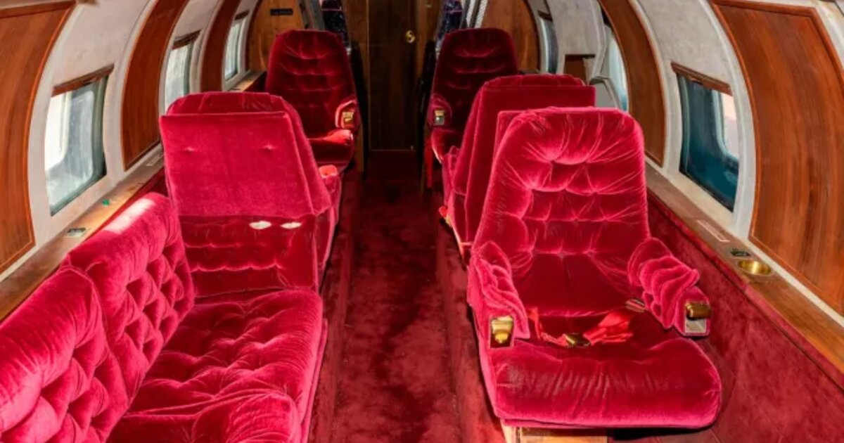 Το τζετ με χώρο για εννέα επιβάτες είναι επενδυμένο με ξύλο, κόκκινο βελούδο, και χρυσές λεπτομέρειες ακόμη και στα παράθυρα.
