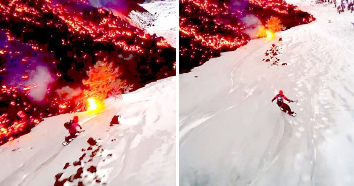 Πλάνα από drone δείχνουν την παράτολμη διαδρομή ενός λάτρη της χιονοσανίδας, κοινώς snowboard, ακριβώς δίπλα στην φλεγόμενη λάβα!