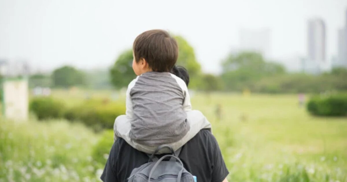 Ένα παιδί στους ώμους του πατέρα του χαμογελά καθώς κάνει μια βόλτα σε ένα πάρκο γεμάτο με κίτρινα φθινοπωρινά φύλλα – αυτή είναι η τυπική εικόνα ενός ιαπωνικού «ikumen».