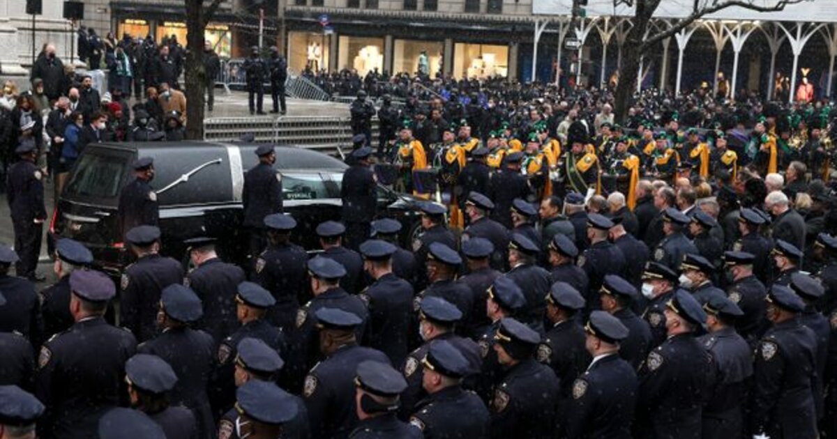 Αστυνομικοί ντυμένοι με μπλε στολές και φορώντας λευκά γάντια μετέφεραν το καλυμμένο με την αμερικανική σημαία φέρετρο του Τζέισον Ριβέρα, 22 ετών, ενός από τους 4 αστυνομικούς που δέχθηκαν πυρά την περασμένη εβδομάδα, στο πλαίσιο της νεκρώσιμης ακολουθίας που τελέστηκε στον ναό του Αγίου Πατρικίου στο Μανχάταν.