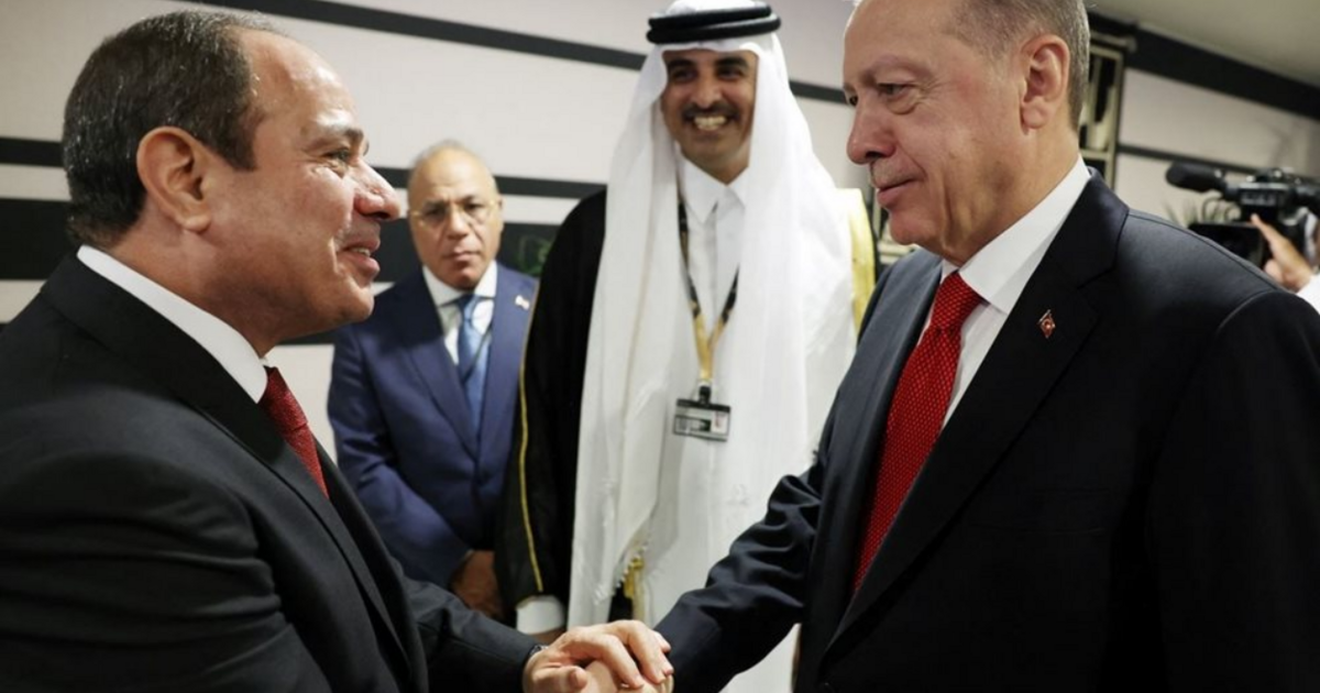 Χθες Κυριακή η τουρκική προεδρία έδωσε στη δημοσιότητα μια φωτογραφία του Ερντογάν με τον Σίσι να ανταλλάσσουν χαμογελαστοί χειραψία στην έναρξη του Παγκοσμίου Κυπέλλου στο Κατάρ -- μια χώρα που ήταν ένας ακόμη μεγάλος σύμμαχος του Μόρσι - με το οποίο η Αίγυπτος συμφιλιώθηκε πρόσφατα.