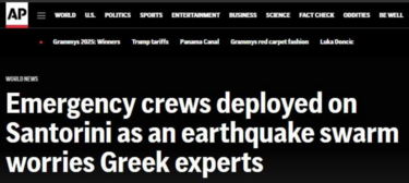 Το Associated Press, σε δημοσίευμά του με τίτλο «Emergency crews deployed on Santorini as an earthquake swarm worries Greek experts» (Συνεργεία έκτακτης ανάγκης αναπτύχθηκαν στη Σαντορίνη καθώς ένα “σμήνος” σεισμών ανησυχεί τους Έλληνες εμπειρογνώμονες), τονίζει ότι οι ελληνικές αρχές έχουν κινητοποιήσει σωστικά συνεργεία στο νησί λόγω της έντονης σεισμικής δραστηριότητας.