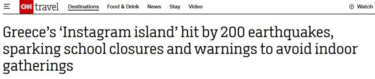 Το CNN αναφέρεται στη Σαντορίνη ως «Greece’s “Instagram island”» (Το ινσταγκραμικό νησί της Ελλάδας) και επισημαίνει ότι το νησί έχει πληγεί από περισσότερους από 200 σεισμούς μέσα σε λίγες ημέρες. Σημειώνει επίσης ότι η Σαντορίνη βρίσκεται στο Ελληνικό Ηφαιστειακό Τόξο, μία από τις πιο ενεργές ηφαιστειακές ζώνες στην Ευρώπη, με περισσότερες από 100 εκρήξεις τα τελευταία 400.000 χρόνια.