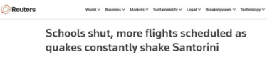 Το Reuters, από την πλευρά του, επικεντρώνεται στις επιπτώσεις που έχει η σεισμική δραστηριότητα στην καθημερινότητα των κατοίκων και των επισκεπτών, γράφοντας: «Schools shut, more flights scheduled as quakes constantly shake Santorini» (Κλειστά τα σχολεία, περισσότερες προγραμματισμένες πτήσεις καθώς οι σεισμοί ταρακουνάνε συνεχώς τη Σαντορίνη).