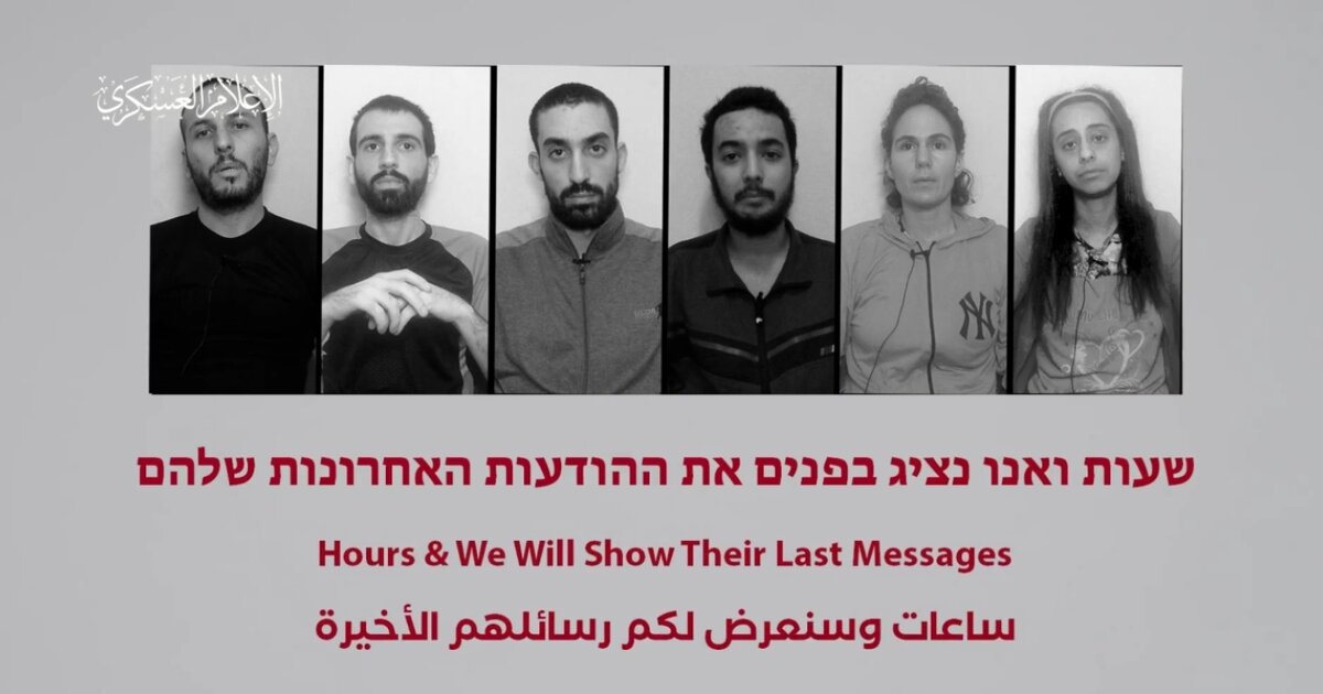 Βίντεο στο Telegram που δείχνει τους έξι πρόσφατα δολοφονημένους ομήρους να μιλούν σε μια κάμερα έδωσε στη δημοσιότητα η Χαμάς, ενώ έκανε γνωστό ότι θα δημοσιεύσει το «τελευταίο τους μήνυμα στον κόσμο».