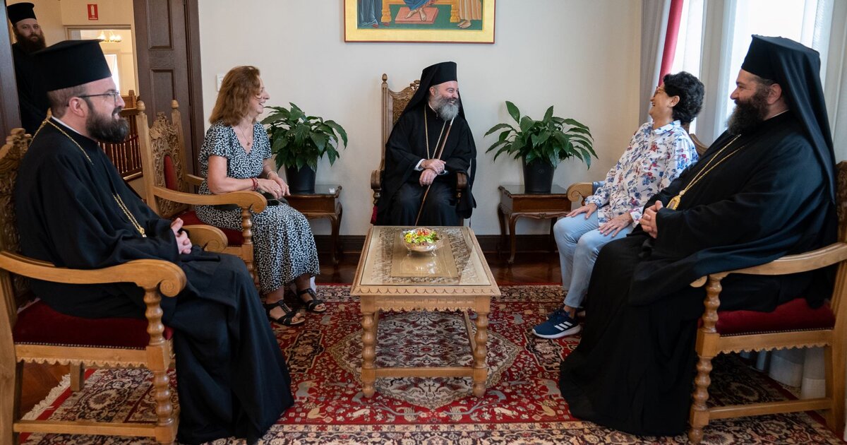 Στη συνέχεια, έγιναν δεκτές με εγκαρδιότητα από το Σεβασμιώτατο Αρχιεπίσκοπο κ.κ. Μακάριο, στα γραφεία της Ιεράς Αρχιεπισκοπής, όπου είχαν μια μακρά και ποιοτική συζήτηση σχετικώς με τη ζωή της Ελληνικής Ομογένειας της Αυστραλίας, τις δραστηριότητες και το έργο της τοπικής Εκκλησίας, καθώς και το πολιτιστικό γίγνεσθαι στη φιλτάτη πατρίδα και στους κόλπους της Ομογενείας. Παρούσα ήταν και η Πρόεδρος του Ελληνικού Φεστιβάλ του Σύδνεϋ, κ. Νία Καρτέρη.