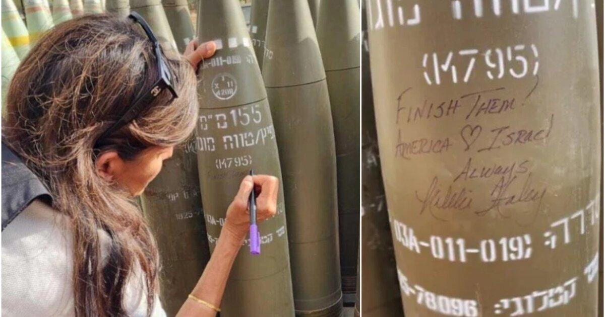 Η Νίκι Χέιλι φωτογραφίζεται καθώς γράφει «αποτελειώστε τους» σε ισραηλινή οβίδα